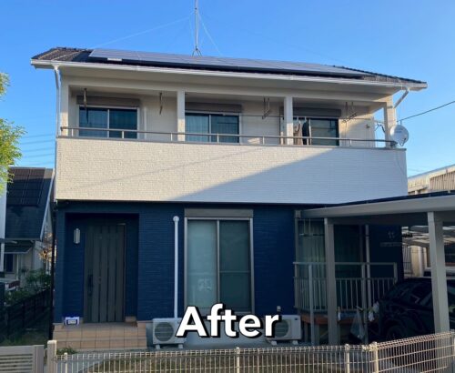 施工後は、1階部分を深みのあるネイビーブルー、2階部分を清潔感のあるホワイトで仕上げ、