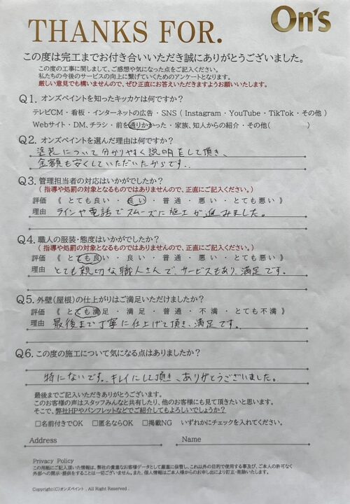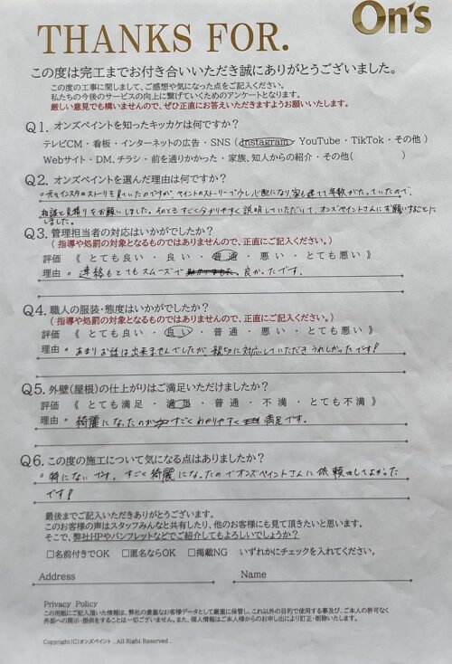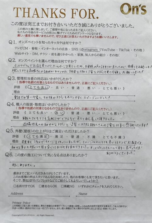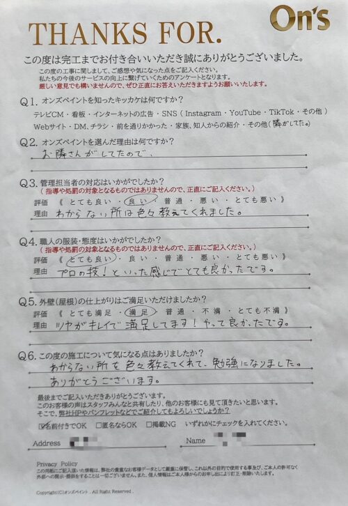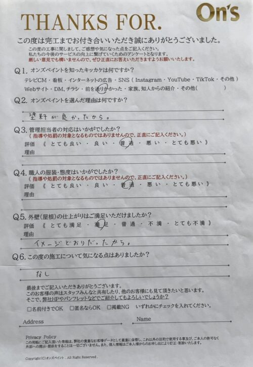 オンズペイントでは、施工後にアンケートをお願いし、お客様のリアルな声を大切にしています。