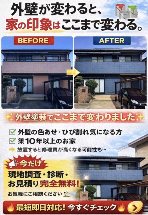 外壁塗装でここまで変わる✨色あせ・ひび割れを解消|無料診断受中付📍