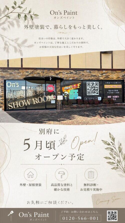 このたびオンズペイントは、別府エリアに新しく外壁塗装ショールームを5月頃オープン予定となりました!