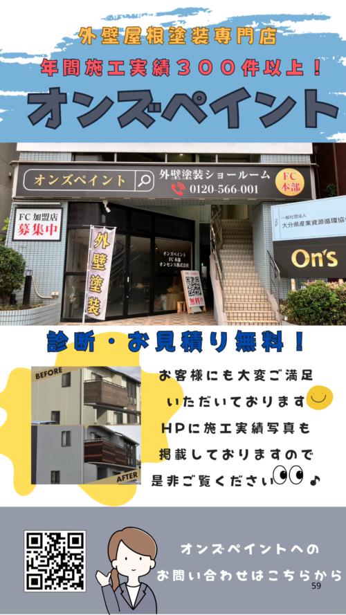 2026.02.13 外壁塗装なら大分市の【オンズペイント】にお任せください🤗オンズペイントは、大分市を中心に外壁塗装・屋根塗装を行う地域密着型の塗装専門店です🎨 「外壁の色あせが気になる」「ひび割れや汚れが目立ってきた」「どこに頼めばいいかわからない」 そんなお悩みを、確かな技術 […]