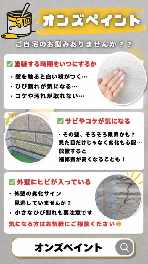 2026.04.07 【外壁塗装タイミングはいつ?劣化サインを見逃さないために】こんにちは!オンズペイントです🎨😊 「外壁塗装っていつやればいいの?」 そんなお悩みはありませんか?🏠💭 実は、外壁には**塗り替えのサイン(劣化症状)** […]