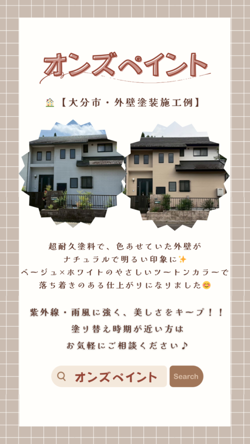 大分市 外壁塗装工事|超耐久塗料で長持ち・美観を両立! 経年劣化により色あせが進んでいた外壁を、耐久性・防汚性に優れた「超耐久塗料」でリフォームしました😊 落ち着いたベージュとホワイトのツートンカラーで、 […]
